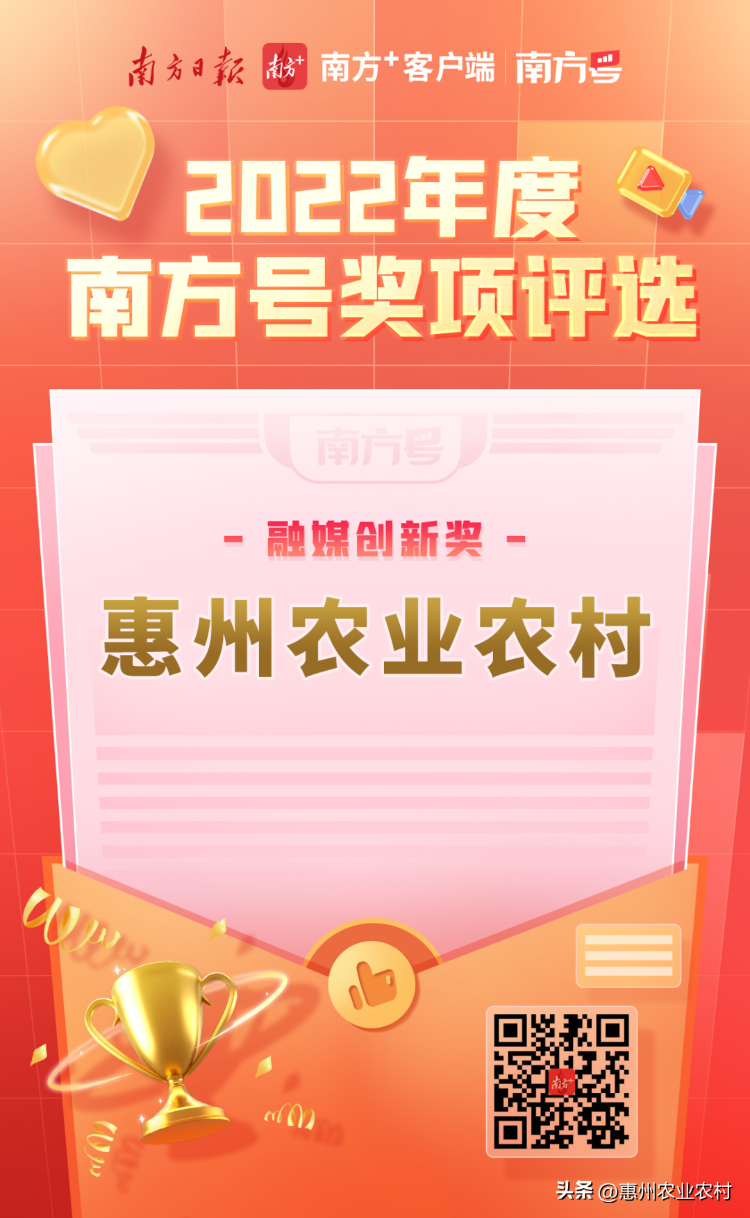 1月17日,2022南方號年度獎項評選結果正式揭曉,“惠州農業農村”喜獲“2022年度融媒創新獎”,這是繼“惠州農業農村”獲得2021南方號年度傳播力獎后,再次獲得南方號年度獎項。 2022年,“惠州農業農村”緊緊圍繞三農信息、涉農政策、鄉村振興等方面內容,共發布信息1584條,多次上榜熱文榜、南方+首頁,150多條文章推送至廣東鄉村振興頻道、南方號頻道,在南方號影響力(總榜)中長期位居前50強,全年最高排名全省19名,在南方號惠州矩陣中,多次位居前五,2022年上半年榮獲南方號“我們這五年”新媒體爆款大賽優秀獎。 策劃宣傳主題,助農解憂解困。2022年,“惠州農業農村”圍繞農業科技特派員下鄉為主題,全面宣傳農業科技特派員下鄉指導農民農業技術、搭建電商平臺、開展學習培訓、送物資等系列活動,切實為農民群眾排憂解難。結合東坡荔枝文化節、鄉村休閑體驗季等活動,全方位宣傳啟動儀式、銷售渠道、旅游精品路線等,受到廣大網友關注。 突出原創特色,不斷尋求突破。“惠州農業農村”在原創海報、短視頻上持續發力,精心設計了二十四節氣原創海報,集本土元素、農耕文化、農業諺語于一體,讓人耳目一新。同時,推送的原創短視頻構圖、畫面、內容創意滿滿,獲得贊譽無數。 聚焦疫情防控,做好輿論引導。隨著疫情防控政策的不斷調整,“惠州農業農村”陸續推出《“新十條”落地!多地防控措施最新調整》《關注!多地疫情防控最新措施速覽》《重要通知發布!涉及農村疫情防控》《居家隔離,這些事一定要做好》等圖文,全方位、多角度、多場域做好疫情防控期間輿論引導和宣傳教育工作。