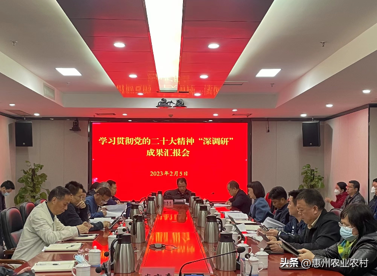 2月5日,惠州市農業農村局黨組召開學習貫徹黨的二十大精神“深調研”成果匯報會,市委農辦主任,市農業農村局黨組書記、局長,市鄉村振興局局長江遠波主持會議并講話,四級調研員以上領導,局各科室、局屬各單位主要負責同志參加會議。 黨的二十大精神會議召開以來,惠州市農業農村局為推動黨的二十大精神在全市農業農村領域落地落實,安排局領導班子成員結合工作實際和分管領域,聚焦重點、深入一線開展專題調查研究,謀劃貫徹落實黨的二十大精神的思路舉措、重點任務、關鍵抓手,形成一批高質量的調研成果和調研報告。會上,相關局領導圍繞新時代黨委農辦工作、高標準農田建后管護、基層農產品質量安全網格化管理、農業科技創新、黃羽雞發展、海洋漁業發展、農業產業高質量發展、農村承包地流轉、防范化解返貧風險、鄉村振興信息宣傳、農村人居環境整治等11個方面內容分享交流了調研成果。 江遠波指出,開展學習調研和成果交流,既是學習貫徹黨的二十大精神的具體行動,也是奮力譜寫中國式現代化惠州新篇章的思想碰撞。“深調研”活動開展以來,局領導班子成員結合分管領域工作,堅持調查研究與檢視問題相結合,開展了一系列學習調研,形成了一批有分量的報告。 江遠波強調,調查研究是我們黨的“傳家寶”。要大力弘揚調查研究的優良傳統,在集中調研基礎上謀劃好籌備好農業農村各項工作。一要提高調查研究能力。堅持以求真務實的精神,把情況摸實摸透,結合中央農村工作會議和全國農業農村廳局長有關會議精神,不斷豐富完善調研報告內容,及時更新調研數據。二要提高調研報告質量。深入研究鄉村振興重點任務和制約農業農村發展的難點、堵點問題,精益求精,把發展的思路舉措進一步研究深、謀劃準,突出操作性,注重實效性,更好地指導下一階段工作。三要抓好調研成果的轉化運用。做好學習調研的“后半篇文章”,把調研成果真正轉化為解決問題、推動工作的具體措施和實現路徑,將調研報告組織匯編成材料,為市委、市政府提供決策參考。