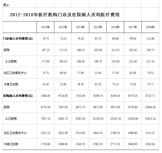 1.醫院門診和住院費用。2018年,全市醫院次均門診費用、次均住院費用分別為236.70元、10084.00元,對比上年分別上漲7.40%和上漲3.32%。其中:公立醫院為227.50元、10451.22元,分別較上年上漲6.11%和上漲2.37%(見圖 9 、見表8)。