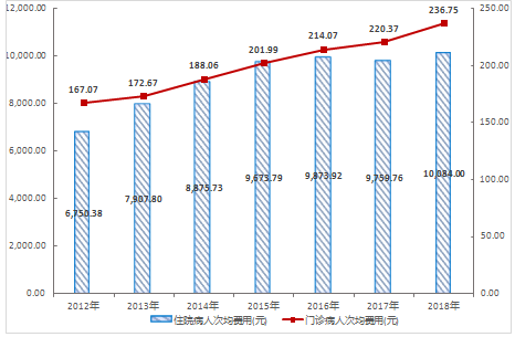 圖9 2011-2018年全市醫院次均門診和住院費用