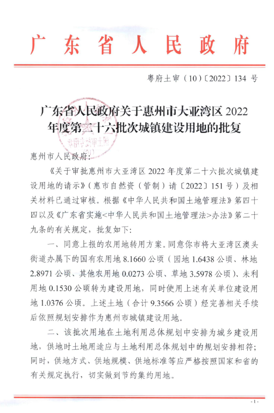 廣東省人民政府關于惠州市大亞灣區2022年度第二十六批次城鎮建設用地的批復