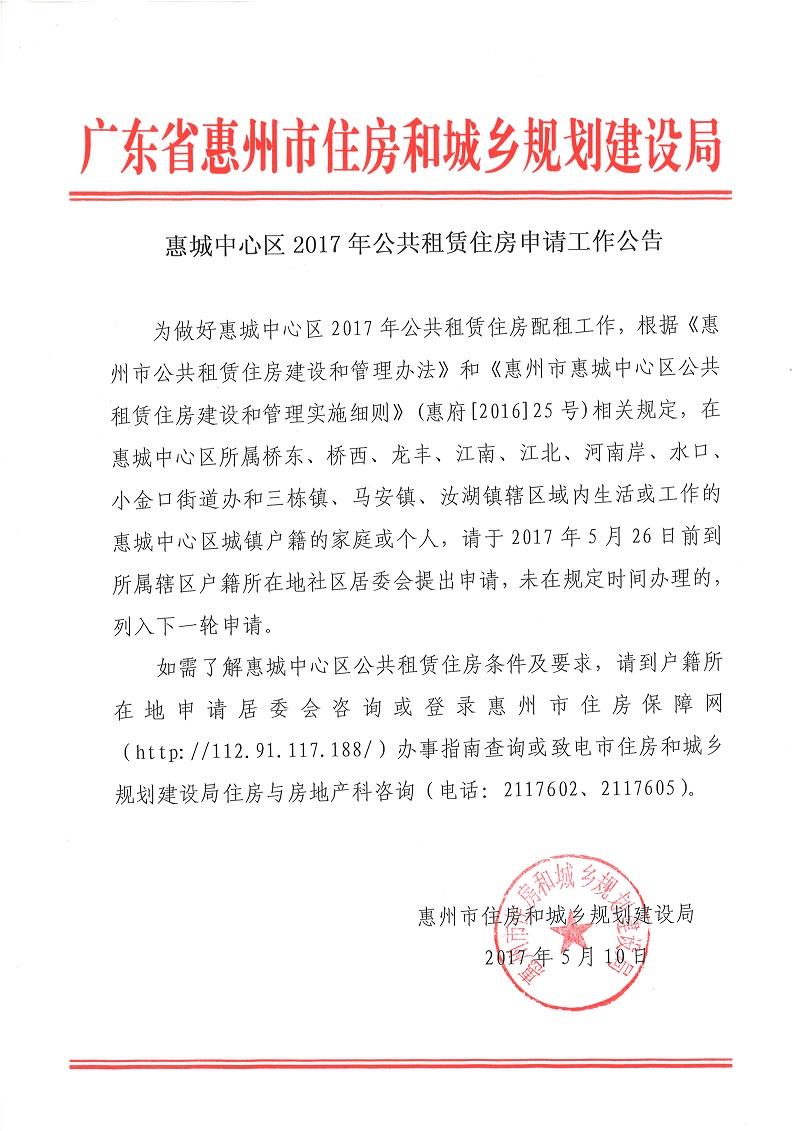 惠城中心區2017年公共租賃住房申請工作公告