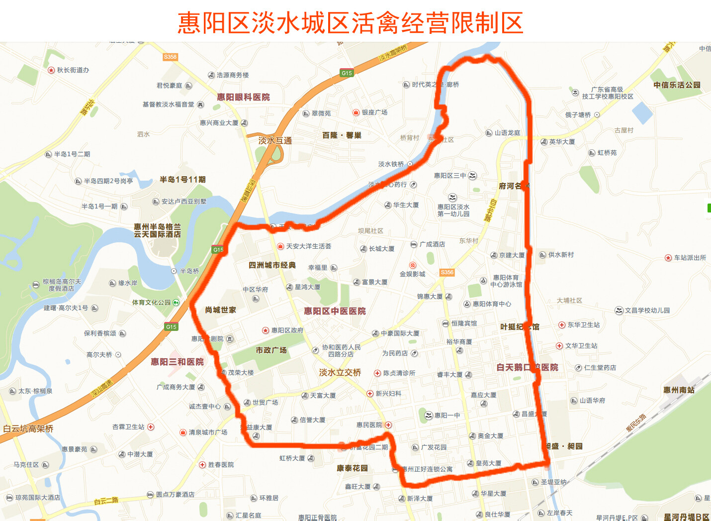 二、惠陽區活禽經營限制區范圍。根據惠陽區實際,選定淡水街道的中心區域及人口密集區域作為活禽經營限制區。具體四至范圍包括: