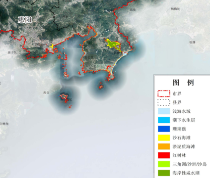 目前,我市約有紅樹林4000畝,其中大部分分布在惠東縣的考洲洋和范和灣,其余主要分布在大亞灣經濟開發區的紅樹林國家城市公園及周邊。惠東縣近年來新營造紅樹林有3000多畝。惠州主要紅樹植物為白骨壤、紅海欖、木欖、秋茄、欖李等,其中,惠東是欖李目前發現的地理分布的最北端。