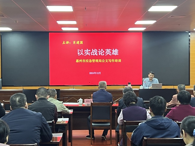 此次培訓邀請了惠州學院客座講師、惠城區委黨校特聘講師、惠城區作家協會主席肖建國同志為大家授課。肖建國同志結合應急管理公文特點,重點圍繞通知、通告、公告、請示等常用公文類型,以理論講解、實例分析、互動交流等方式,深入剖析常見問題和易犯錯誤,對全局干部職工提高公文處理和寫作能力具有極強的針對性和操作性。