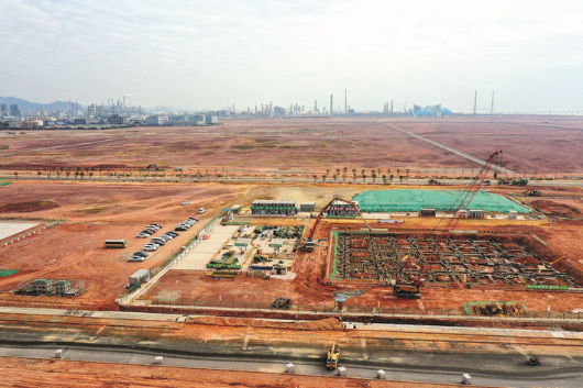 埃克森美孚惠州乙烯項(xiàng)目施工現(xiàn)場,各種運(yùn)輸車、大型機(jī)械緊張有序施工。