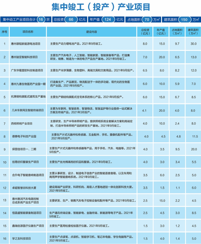 數據顯示,今年1~9月,惠城區新動工、竣工(投產)項目58宗,總投資419億元,達產后年產值約799億元,同比去年(27宗、104億元、270億元)分別增長115%、300%和194%。產業項目進一步彰顯發展新勢能,體現了惠城區牢固樹立的“項目為王”理念。